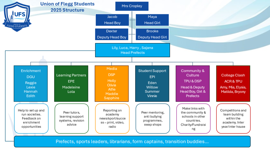 “The Union of Flegg Students follows a model of pupil voice that gives the overwhelming majority of students in the academy the feeling that they have genuine impact on academy life. It promotes the British values of democracy and leadership and encourages active participation to an outstanding level.”