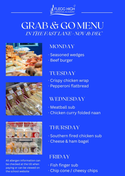 We use a cashless catering system. Every student has an account that can be topped up using the schools online payment system through our website. Children claiming for Free School Meals are treated the same as everyone else. Their accounts are automatically credited every day and they can choose at lunchtime from any of the options available.