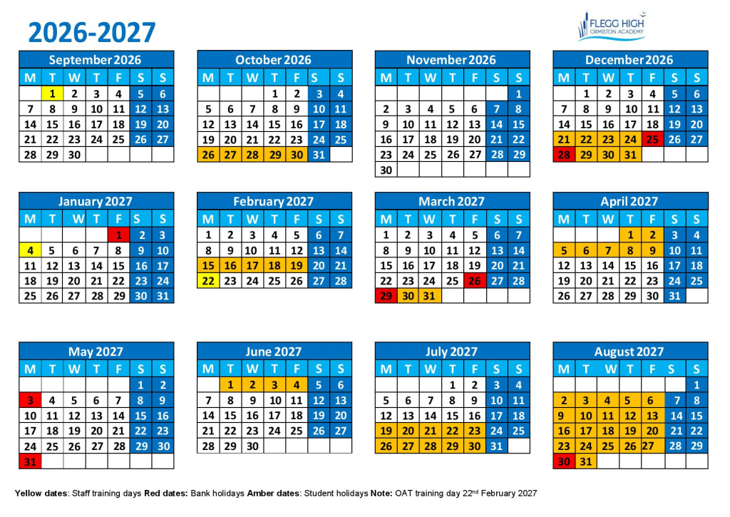 Key: Yellow dates: Staff training days (academy closed for students) Red dates: Bank holidays Amber dates: Student holiday